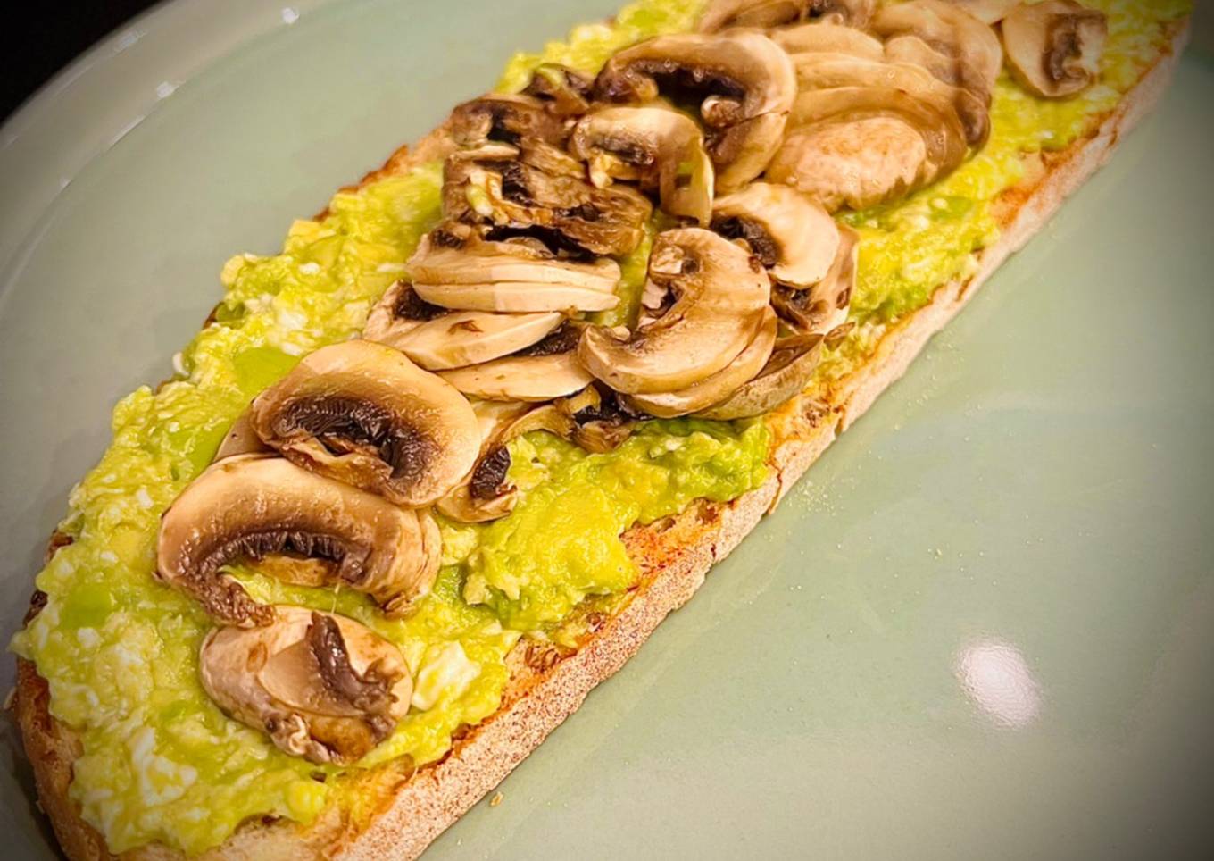 - 🥑 Después de tostar el pan, untamos la pasta verde y coronamos con las setas