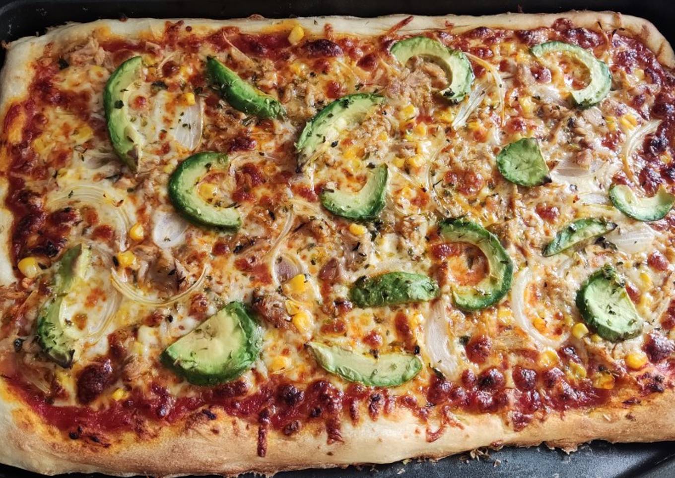 Pizza con aguacate, atún, maíz y cebolla 😋