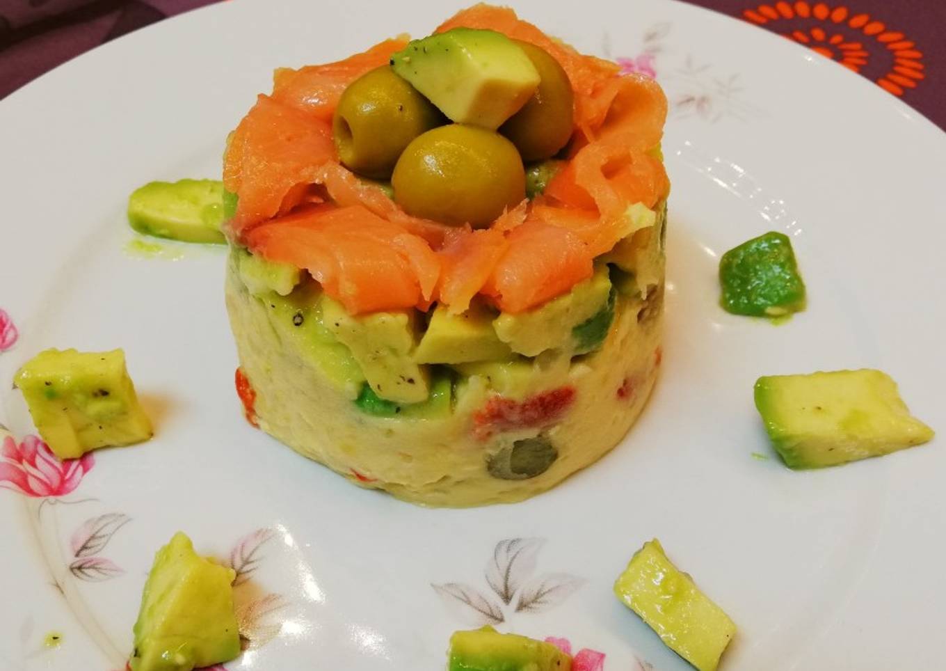- Montamos el tartar colocando primero la ensaladilla, después el aguacate, luego el salmón y por último unas aceitunas.