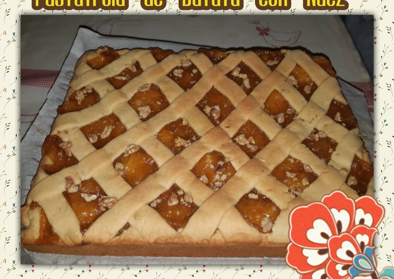 - Luego agregamos poco a poco la harina hasta formar una masa homogénea y suave, tapar con film y llevar a heladera por 30'... Luego colocamos papel manteca so re el molde y enmantecado. Estira la masa la colocó sobre el molde y luego por encima colocamos el dulce de batata luego cortamos las tiritas colocamos por encima del dulce y agregar las nueces picadas, llevamos a horno por 35 minutos