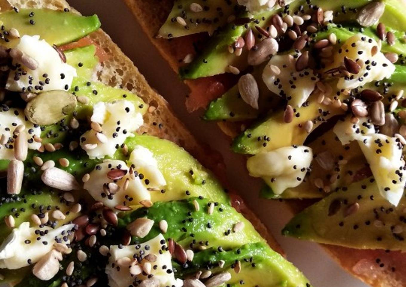 Tostadas con tomate, aguacate, queso de cabra y semillas