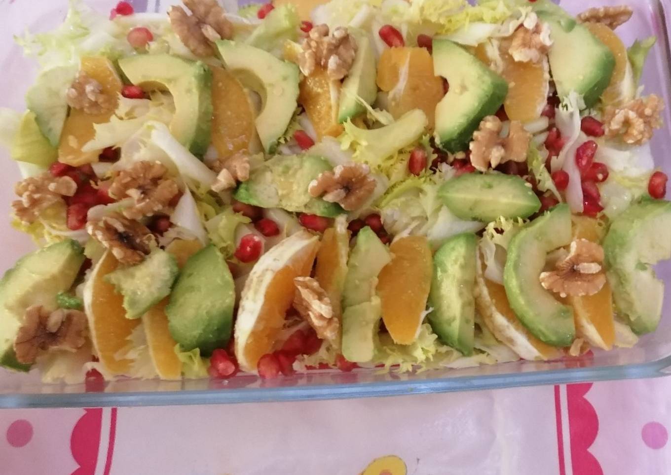 Ensalada de naranja, nueces, aguacate y granada