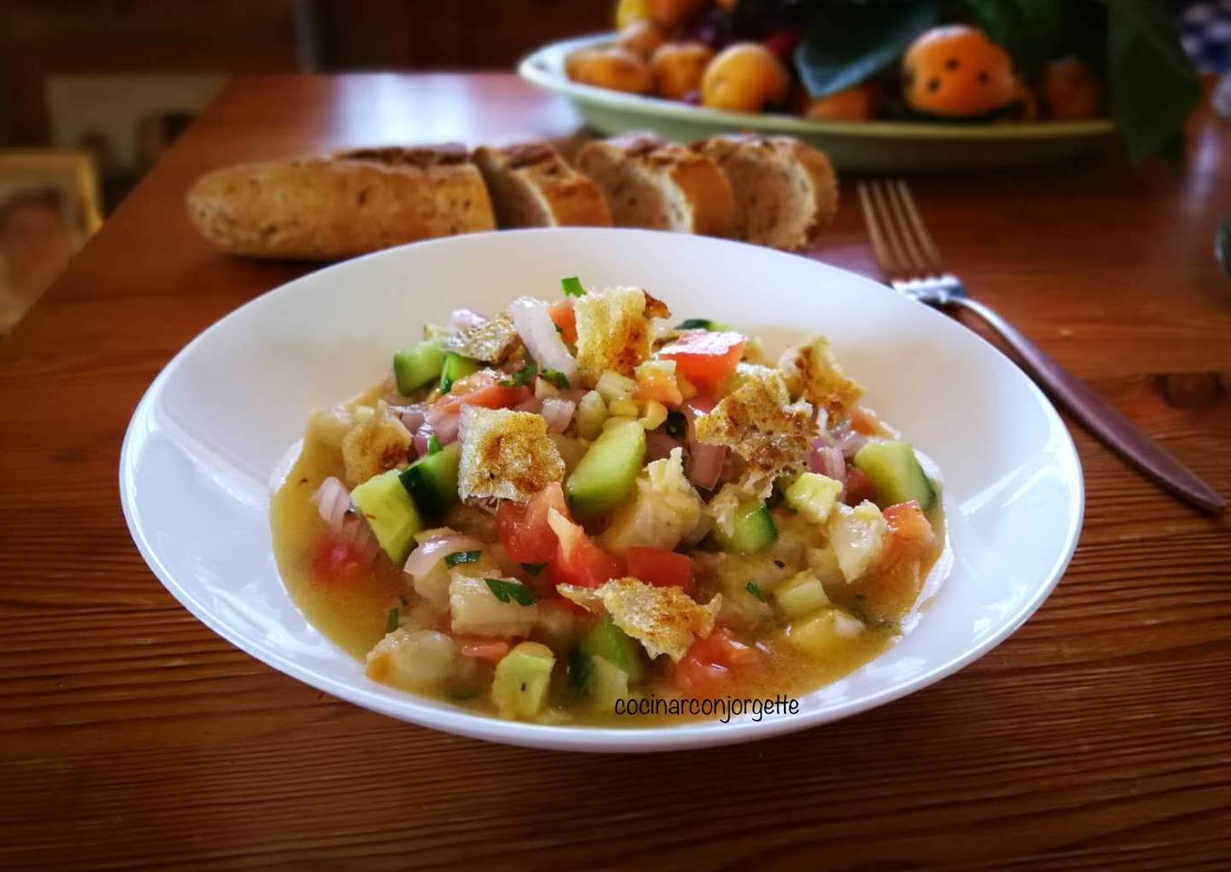 - Tapar el bol con film transparente y reservar en la nevera para 30 minutos. Repartir el salpicón en dos boles y servir bien frío con la corteza rota en trozos por encima de cada plato.