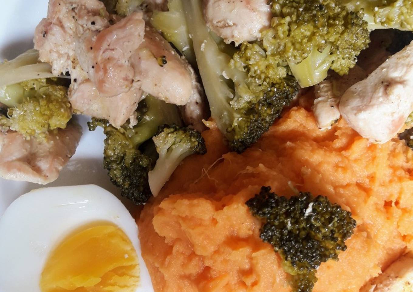 - Después de los 5 minutos, emplatas. Acompáñalo con huevo duro si deseas. Una buena porción (generosa🤗) del puré de camote que está buenisimoooo, y mira con sólo 3 ingredientes, mantequilla, leche evaporada y una pizca de sal. Muy rico, ya sabes, menos es más.