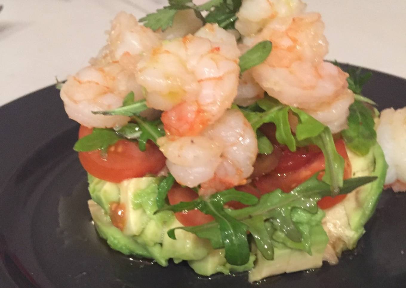 - Encima del aguacate ponemos los tomatitos cortados a rodajas, salpimentamos; luego ponemos la rúcula, y por último las gambas. Rectificamos de sal y aceite y decoramos con una hoja de cilantro. Servir. Bon appétit!